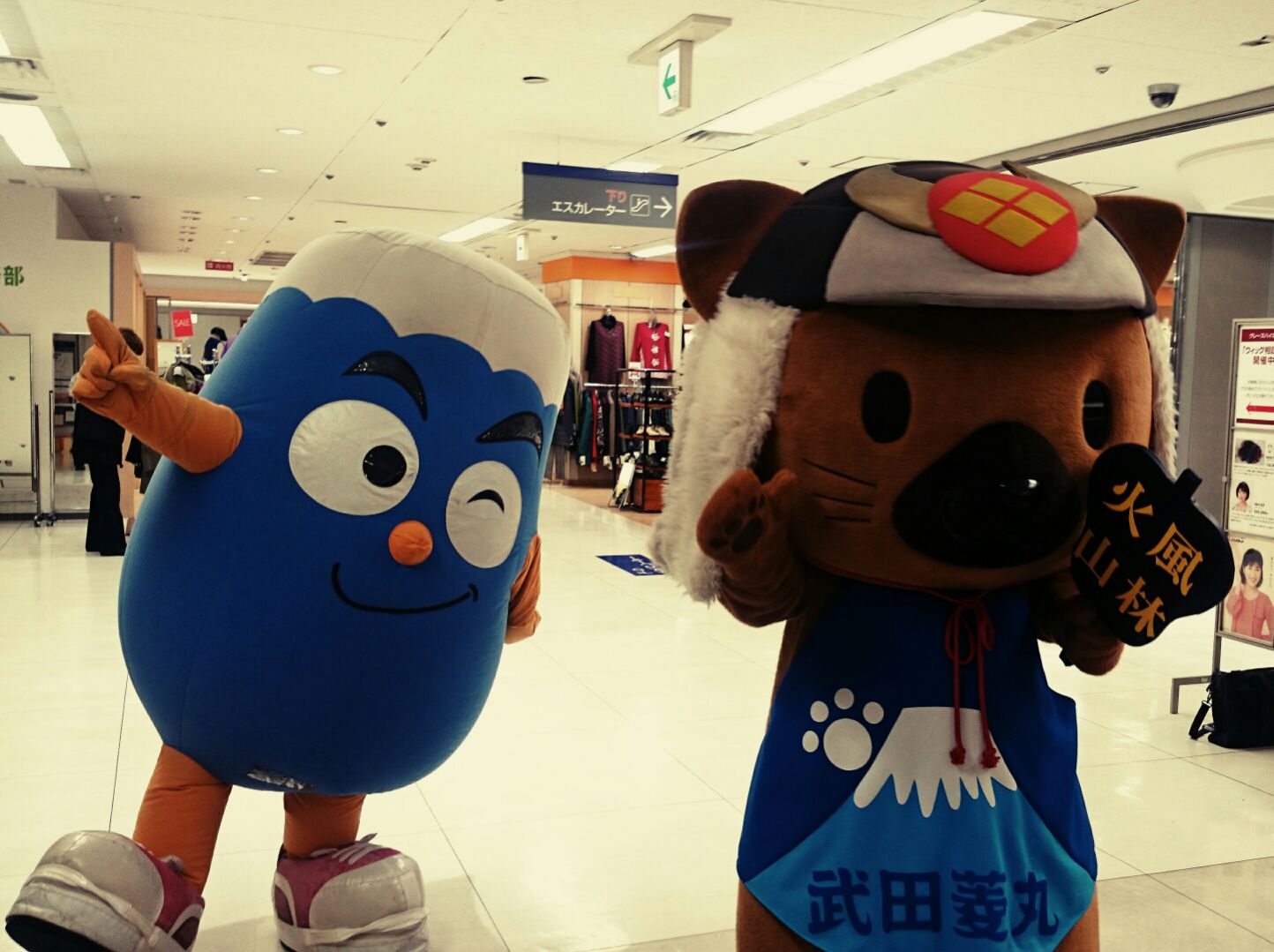 目の前にあらわる、ゆるキャラ・武田菱丸さんとふじっぴーさん。